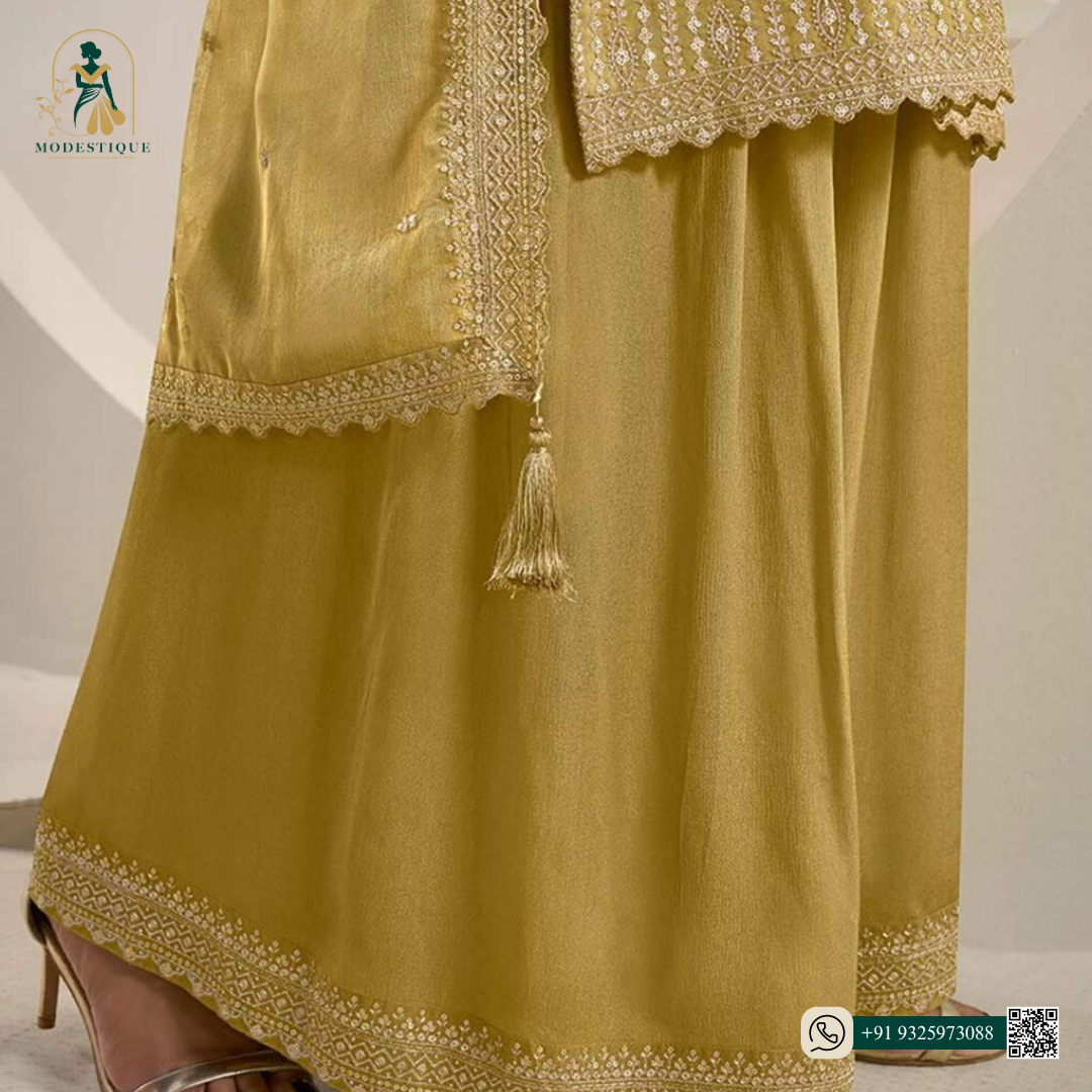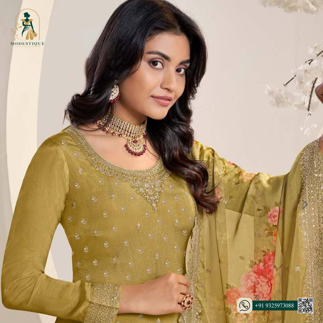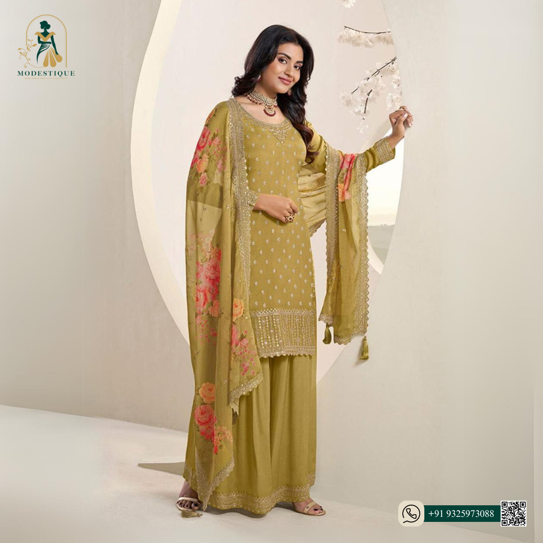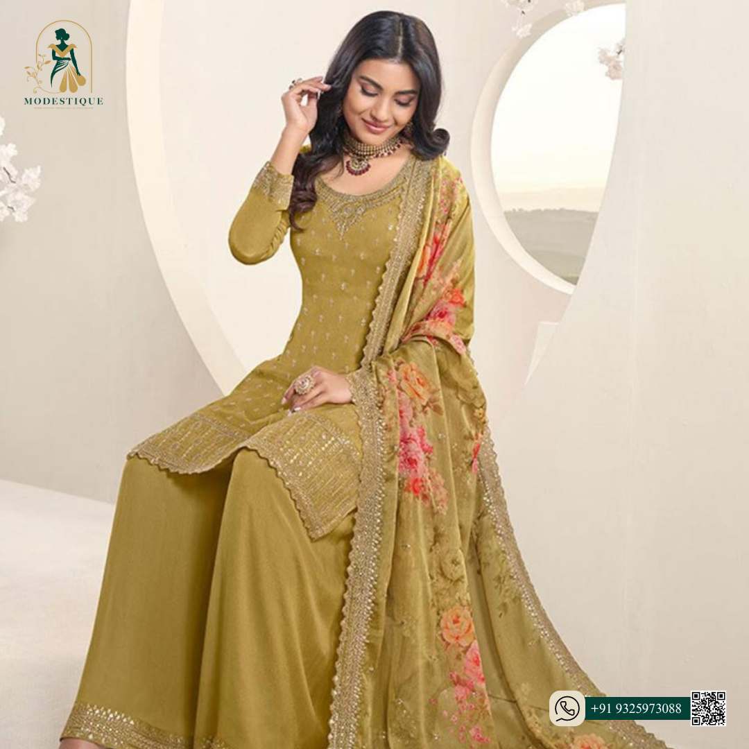 beautifully crafted with delicate embroidery and features a flowing floral-printed dupatta, adding a touch of grace and sophistication.